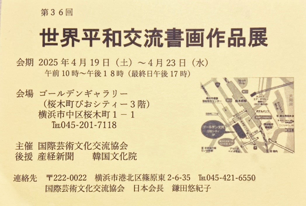 | 展覧会名 会期 会場 団体・代表名 | 第36回 世界平和交流書画作品展 4月19日(土)~4月23日(水) 神奈川・桜木町ぴおシティ3階 ゴールデンギャラリー 国際芸術文化交流協会・鎌田悠紀子 |