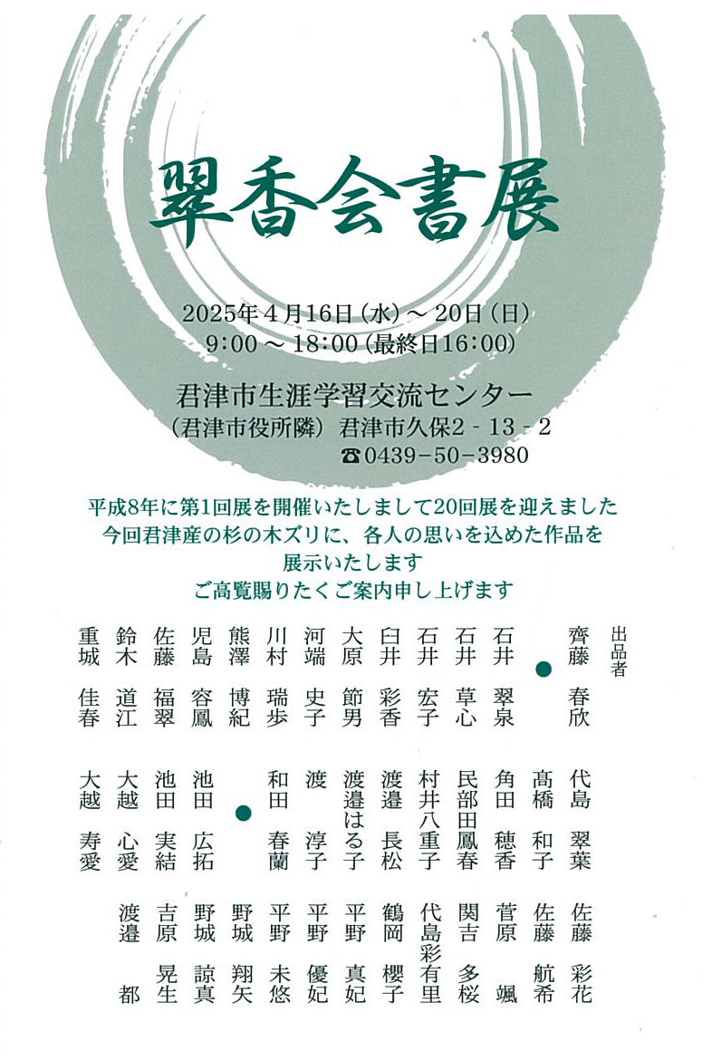 | 展覧会名 会期 会場 団体・代表名 | 翠香会書展 4月23日 (木)〜 4月26日 (日) 千葉・君津市生涯学習交流センター 翠香会・齊藤春欣 |
