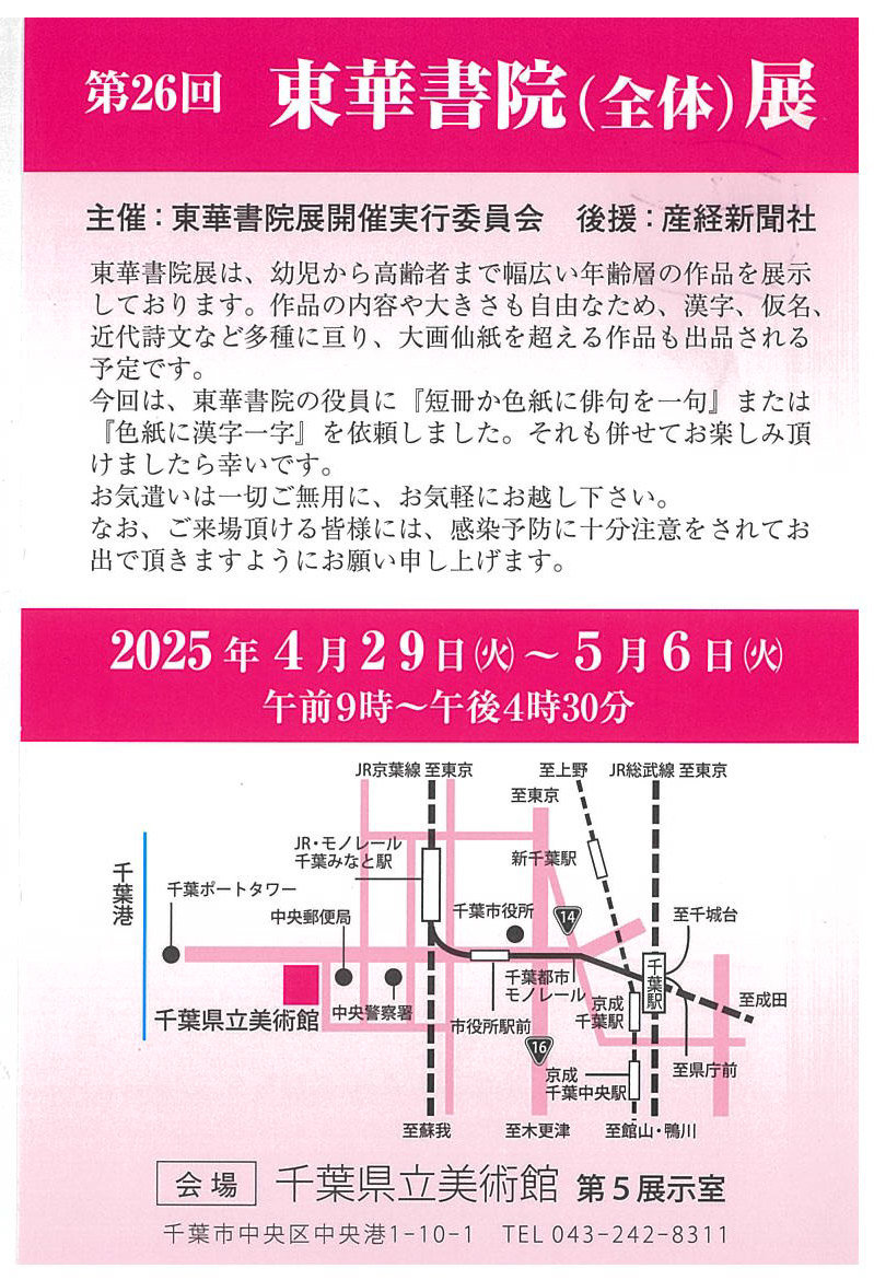| 展覧会名 会期 会場 団体・代表名 | 第26回東華書院展 4月29日(火)~5月6日(火) 千葉・千葉県立美術館 東華書院 ・齊藤華秀 |