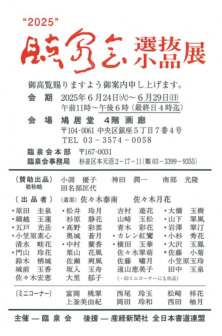 | 展覧会名 会期 会場 団体・代表名 | 2025臨泉会選抜小品展 6月24日(火)~6月29日(日) 東京・銀座鳩居堂 臨泉会・原田圭泉 |