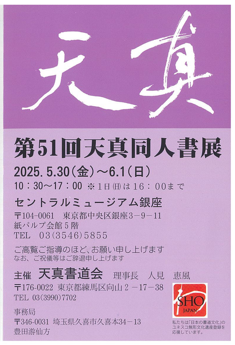 | 展覧会名 会期 会場 団体・代表名 | 第51回天真同人書展 5月30日(金)~6月1日(日) 東京・セントラルミュージアム銀座 天真書道会・人見恵風 |