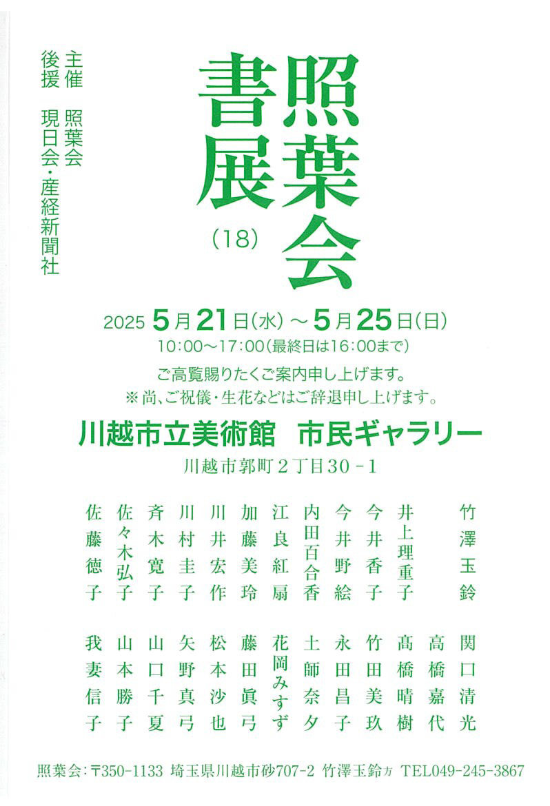 | 展覧会名 会期 会場 団体・代表名 | 第18回照葉会書展 5月21日(水)~5月25日(日) 埼玉・川越市立美術館 市民ギャラリー 照葉会・竹澤玉鈴 |