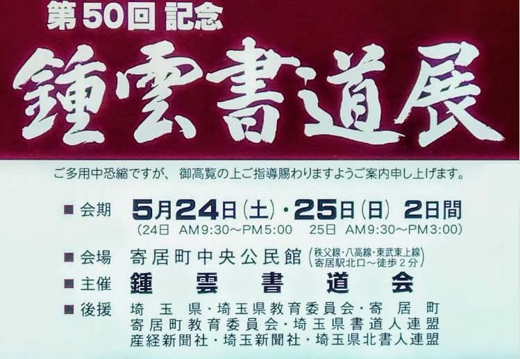 | 展覧会名 会期 会場 団体・代表名 | 第50回記念 鍾雲書道展覧会 5月24日(土)~5月25日(日) 埼玉・寄居町中央公民館 鍾雲書道会・大澤芳洲 |