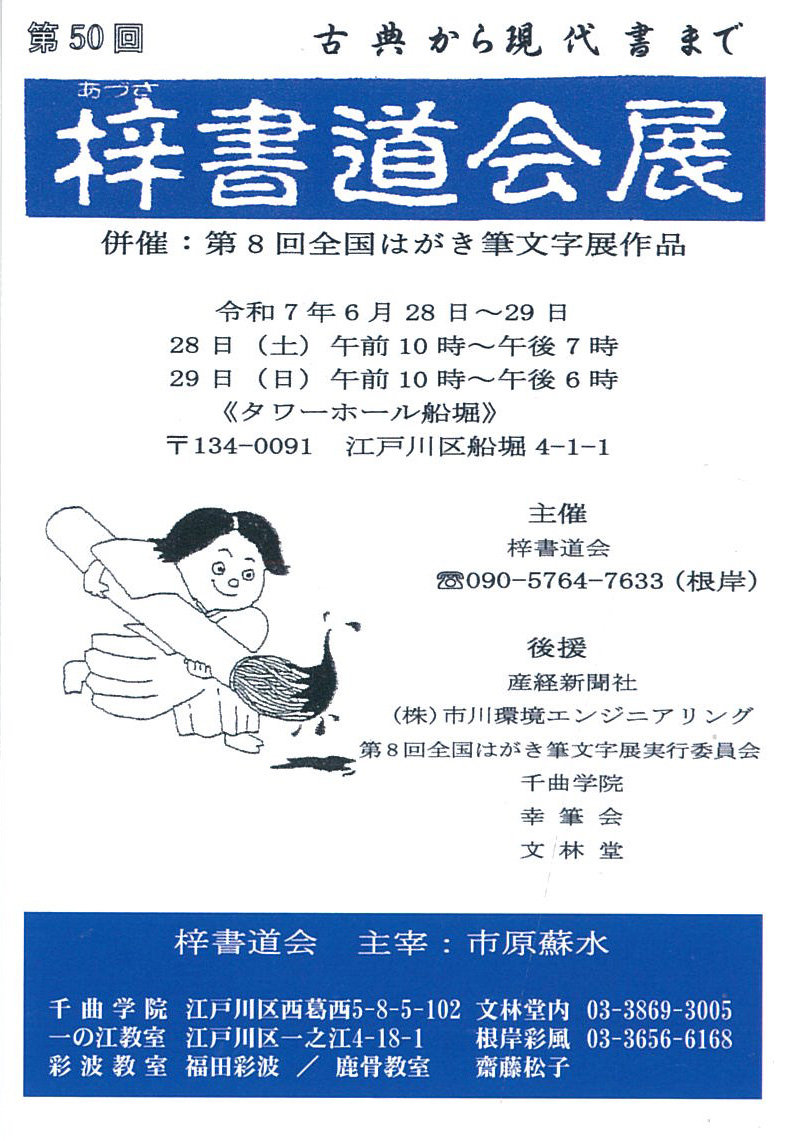 | 展覧会名 会期 会場 団体・代表名 | 第50回梓書道会展 6月28日(土)~6月29日(日) 東京・タワーホール船堀 梓書道会・市原蘇水 |