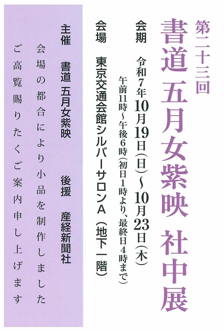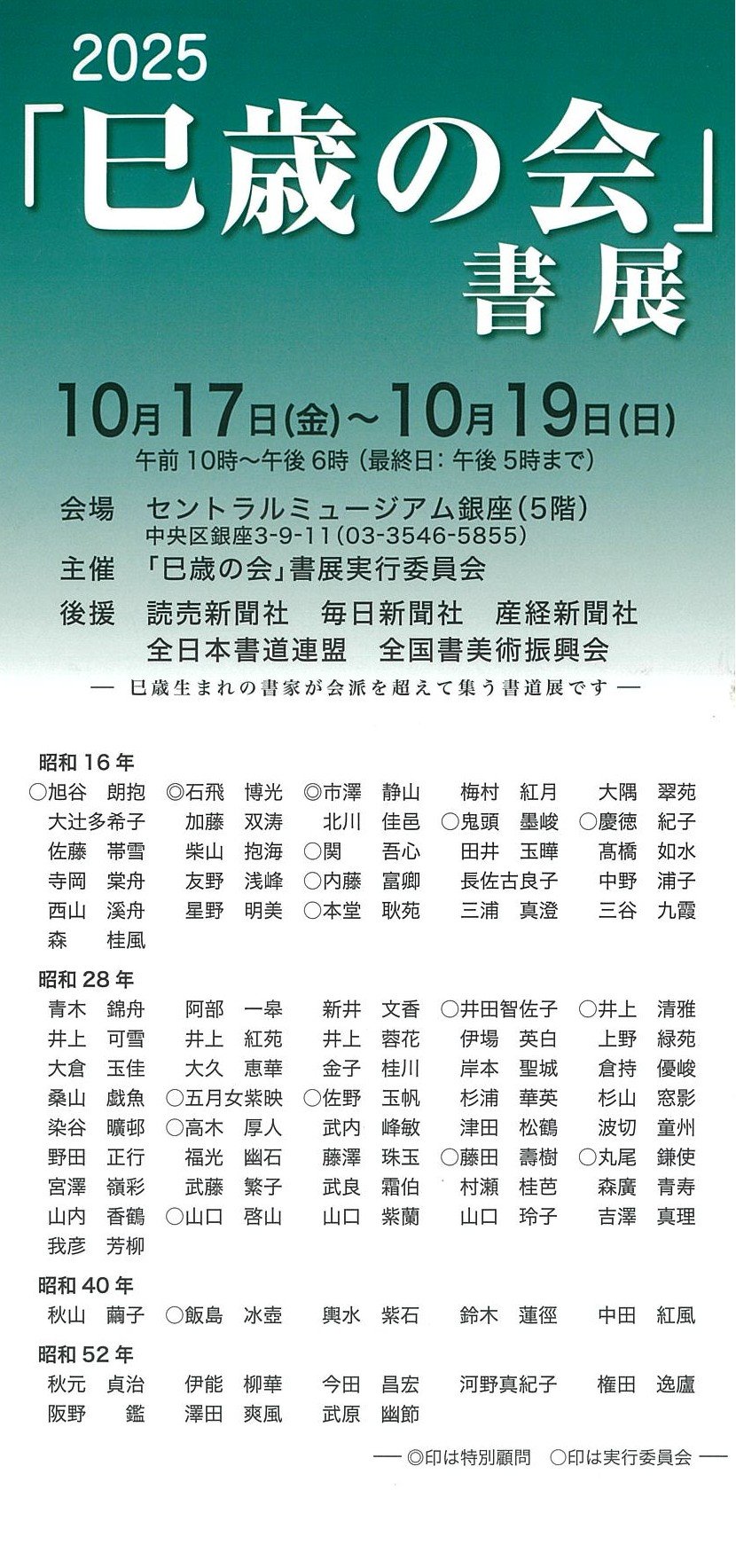 | 展覧会名 会期 会場 団体・代表名 | 2025「巳歳の会」書展 10月17日(金)~10月19日(日) 銀座 セントラルミュージアム 「巳歳の会」書展実行委員会・五月女紫映 |