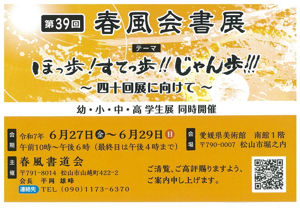 | 展覧会名 会期 会場 団体・代表名 | 第39回春風会書展 6月27日(金)~6月29日(日) 愛媛・愛媛県美術館 春風書道会・平岡雄峰 |