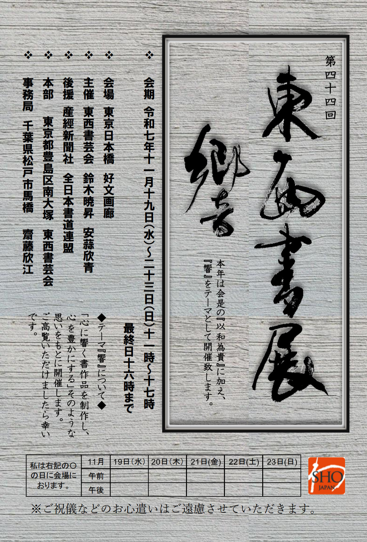 | 展覧会名 会期 会場 団体・代表名 | 第44回東西書展 11月19日(水)~11月23日(日) 日本橋 好文画廊 東西書芸会・鈴木曉昇 |