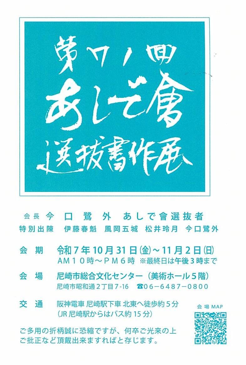 | 展覧会名 会期 会場 団体・代表名 | 第71回あしで會選抜書作展 10月31日(金)~11月2日(日) 大阪・尼崎市総合文化センター あしで會・今口鷺外 |
