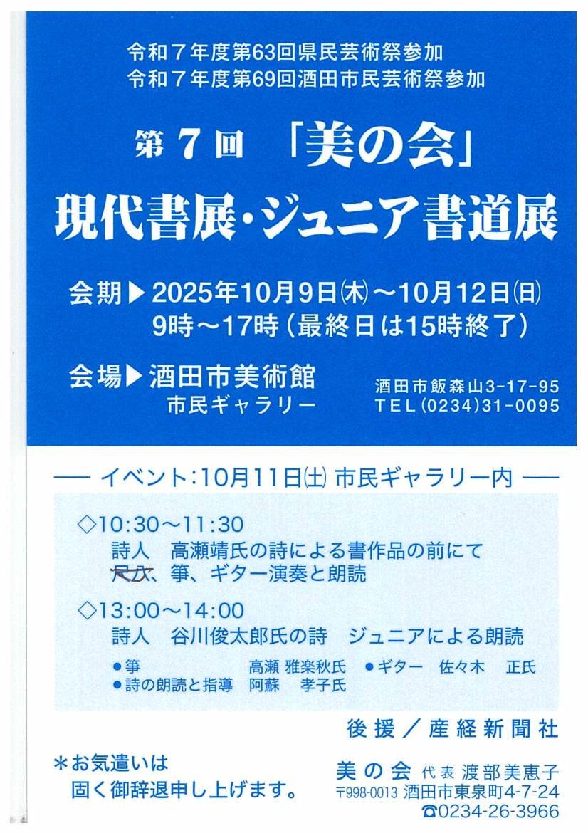 | 展覧会名 会期 会場 団体・代表名 | 第7回「美の会」現代書展・ジュニア書道展 10月9日(木)~10月12日(日) 酒田市美術館市民ギャラリー 美の会・渡部美恵子 |
