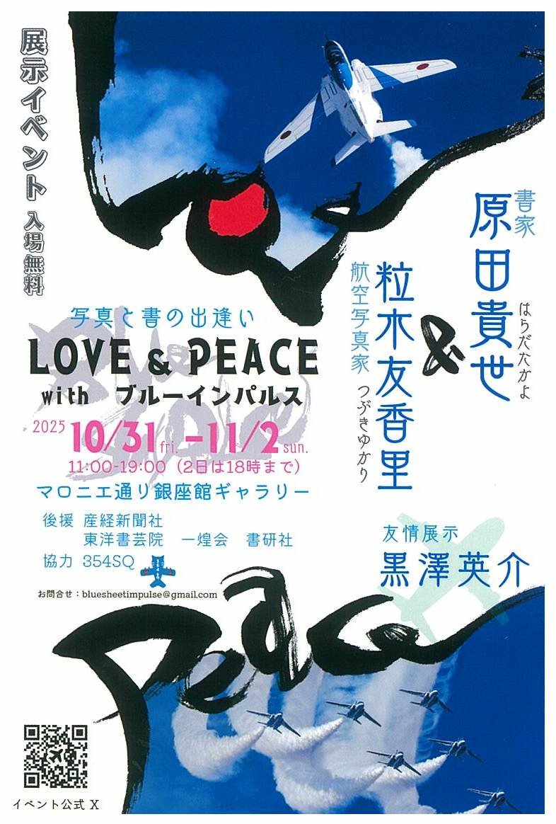 | 展覧会名 会期 会場 団体・代表名 | 写真と書の出遭い「LOVE & PEACE」with ブルーインパルス 10月31日(金)~11月2日(日) 東京・マロニエ通り銀座館ギャラリー 原田貴世 |