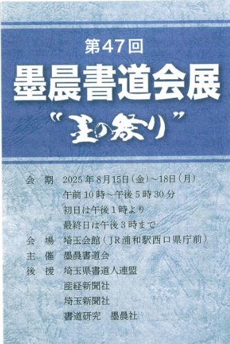 | 展覧会名 会期 会場 団体・代表名 | 第47回墨晨展 8月15日(金)~8月18日(月) 埼玉・埼玉会館 墨晨書道会・岩田正直 |