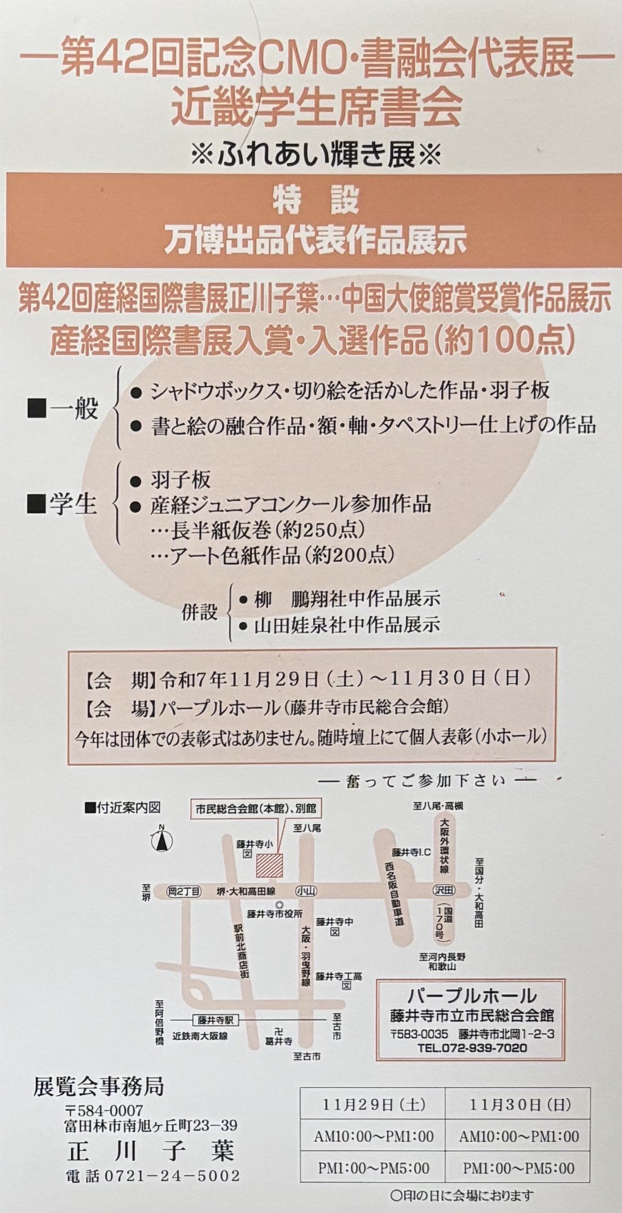 | 展覧会名 会期 会場 団体・代表名 | 第42回記念CMO展・近畿席書大会 11月29日(土)~11月30日(日) 大阪・藤井寺市立市民総合会館 書融会・正川子葉 |