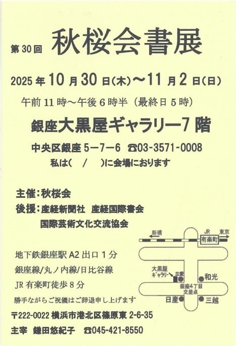 | 展覧会名 会期 会場 団体・代表名 | 第30回秋桜会書展 10月30日(木)~11月2日(日) 東京・銀座大黒屋ギャラリー7階 秋桜会主宰・鎌田悠紀子 |