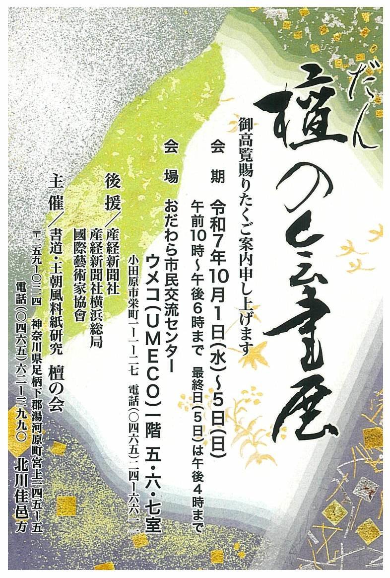 | 展覧会名 会期 会場 団体・代表名 | 檀の会書展 10月1日(水)~10月5日(日) 神奈川・おだわら市民交流センターUMECO 1階5、6、7室 檀の会・北川佳邑 |