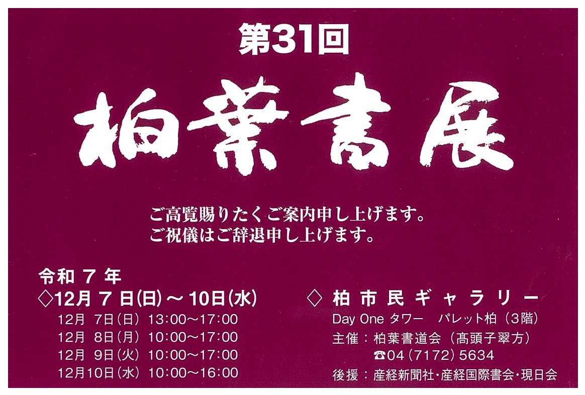 | 展覧会名 会期 会場 団体・代表名 | 第31回柏葉書展 12月7日(日)~12月10日(水) 柏市民ギャラリー 柏葉書道会・髙頭子翠 |