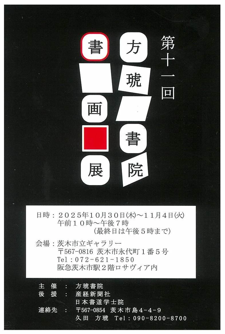 | 展覧会名 会期 会場 団体・代表名 | 第11回方琥書院書画展 10月30日(木)~11月4日(火) 大阪・茨木市立ギャラリー 日本書道学士院・久田方琥 |
