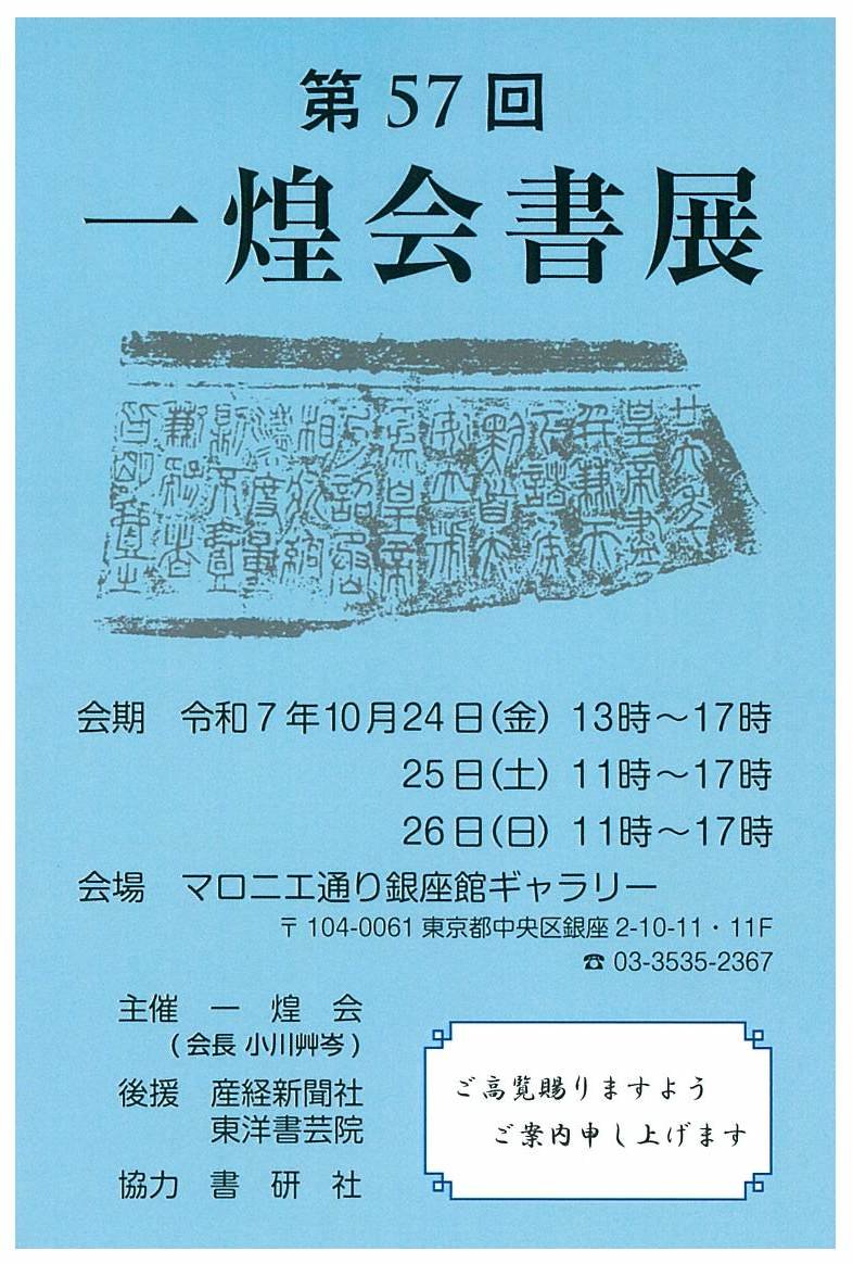 | 展覧会名 会期 会場 団体・代表名 | 第57回一煌会書展 10月24日(金)~10月26日(日) 東京・マロニエ通り銀座館ギャラリー 一煌会・小川艸岑 |