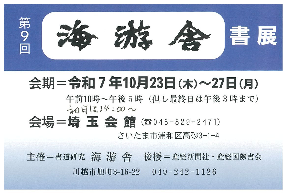 | 展覧会名 会期 会場 団体・代表名 | 第9回海游舎書展 10月23日(木)~10月27日(月) 埼玉・埼玉会館 海游舎・山下海堂 |