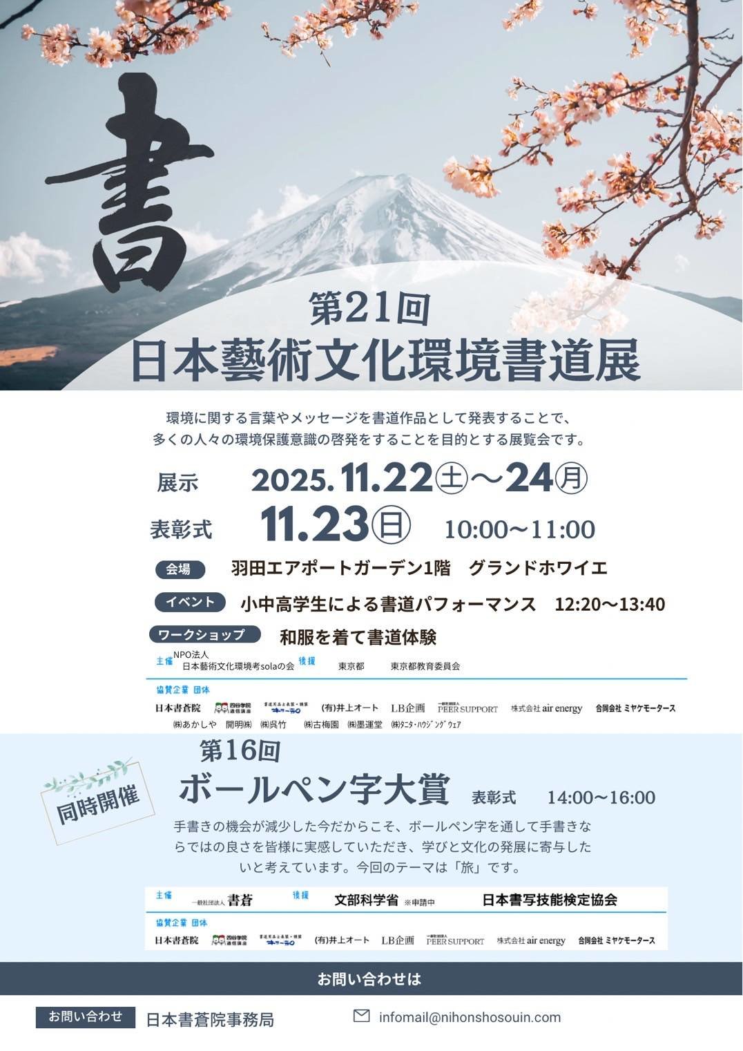| 展覧会名 会期 会場 団体・代表名 | 第21回日本藝術文化環境書道展 11月22日(土)~11月24日(月・祝) 羽田エアポートガーデン グランドホワイエ 日本書蒼院・谷蒼涯 |