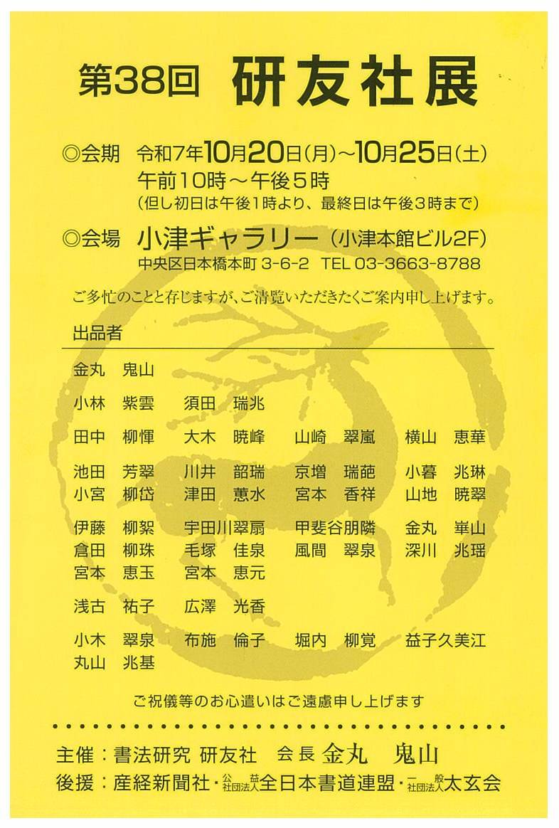 | 展覧会名 会期 会場 団体・代表名 | 第38回研友社展 10月20日(月)~10月25日(土) 日本橋 小津ギャラリー 書法研究 研友社・金丸鬼山 |