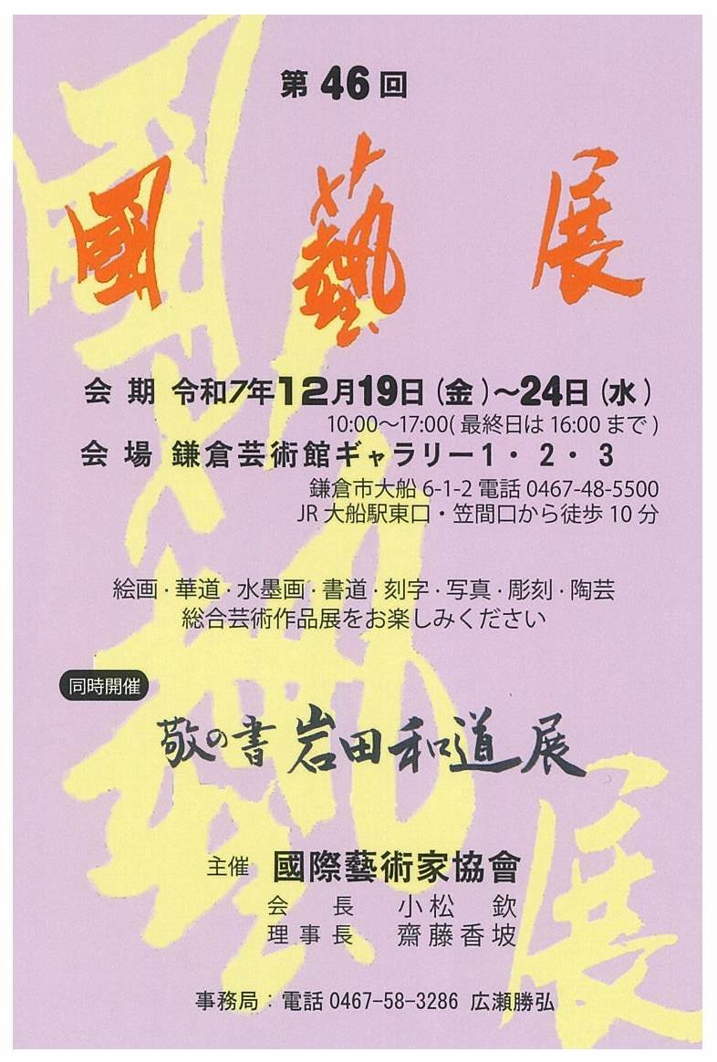 | 展覧会名 会期 会場 団体・代表名 | 第46回國藝展 12月19日(金)~12月24日(水) 鎌倉芸術館ギャラリー 國際藝術家協會・斎藤香坡 |