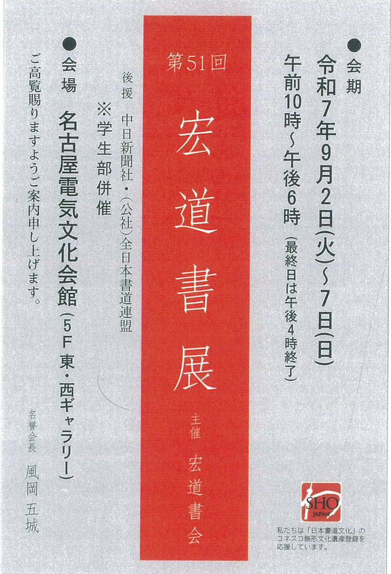 | 展覧会名 会期 会場 団体・代表名 | 第51回宏道書展 9月2日(火)~9月7日(日) 愛知・名古屋電気文化会館 宏道書会・山本晴城 |
