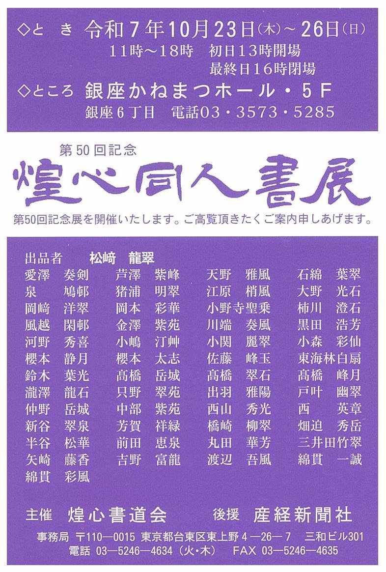 | 展覧会名 会期 会場 団体・代表名 | 第50回記念煌心同人書展 10月23日(木)~10月26日(日) 銀座かねまつホール 煌心書道会・松﨑龍翠 |