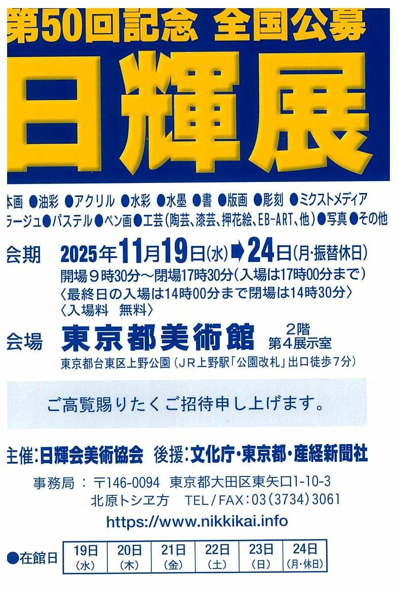 | 展覧会名 会期 会場 団体・代表名 | 全国公募 第50回記念 日輝展 11月19日(水)~11月24日(日) 東京都美術館 日輝会美術協会・阿相三郎 |