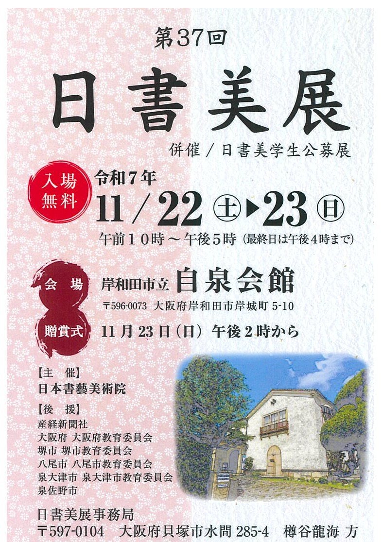 | 展覧会名 会期 会場 団体・代表名 | 第37回日書美展 11月22日(土)~11月23日(日) 大阪・岸和田市立自泉会館 日本書藝美術院・太田春麗 |