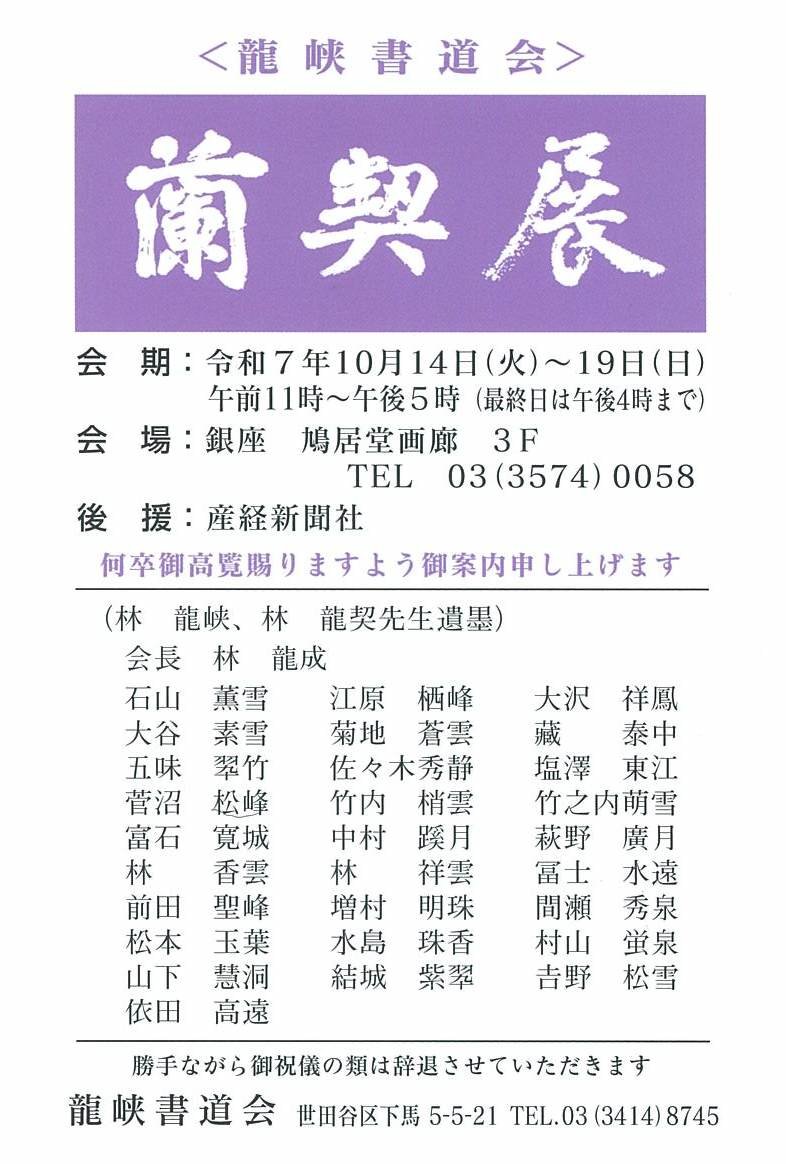 | 展覧会名 会期 会場 団体・代表名 | 第31回蘭契展 10月14日(水)~10月19日(日) 銀座 鳩居堂3 階 龍峡書道会・林龍成 |