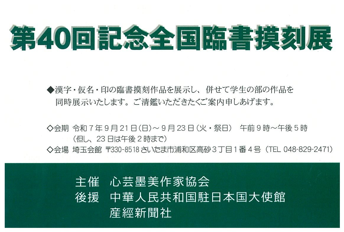 | 展覧会名 会期 会場 団体・代表名 | 第40回全国臨書摸刻展 9月21日(日)~9月23日(火) 埼玉・埼玉会館 心芸墨美作家協会・岩浅写心 |