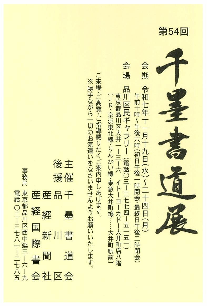 | 展覧会名 会期 会場 団体・代表名 | 第54回千墨書道展 11月19日(水)~11月24日(月) 品川区民ギャラリー 千墨書道会・近藤豊泉 |