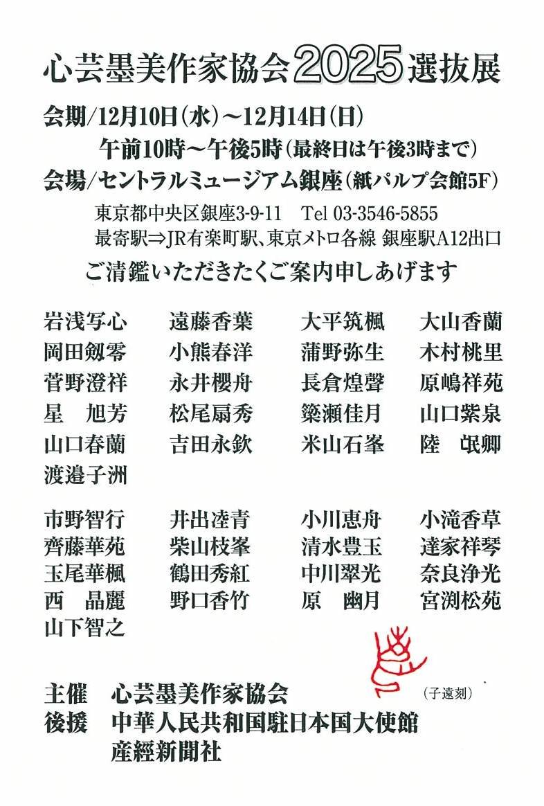 | 展覧会名 会期 会場 団体・代表名 | 心芸墨美作家協会 2025選抜展 12月10日(水)~12月14日(日) 銀座 セントラルミュージアム 心芸墨美作家協会・岩浅写心 |