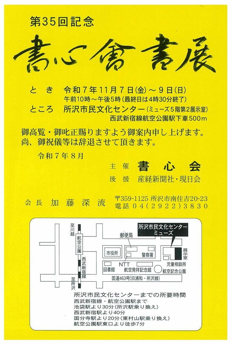 | 展覧会名 会期 会場 団体・代表名 | 第35回記念 書心会書展 11月7 日(金)~11月9 日(日) 埼玉・所沢市民文化センター ミューズ 書心会・加藤深流 |