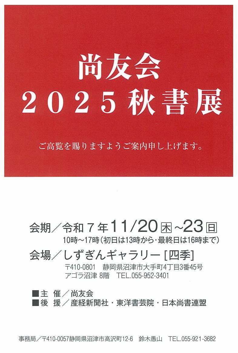 | 展覧会名 会期 会場 団体・代表名 | 尚友会2025秋書展 11月20日(木)~11月23日(日) 静岡・しずぎんギャラリー 四季 尚友会・小杉修史 |
