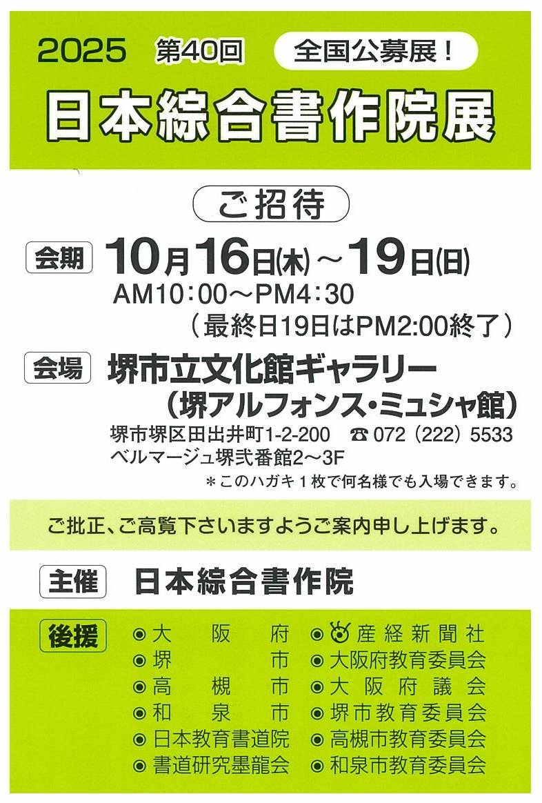 | 展覧会名 会期 会場 団体・代表名 | 第40回日本綜合書作院展 10月16日(木)~10月19日(日) 大阪・堺市立文化館(堺 アルフォンス・ミュシャ館) 日本綜合書作院・篠原秀朋 |