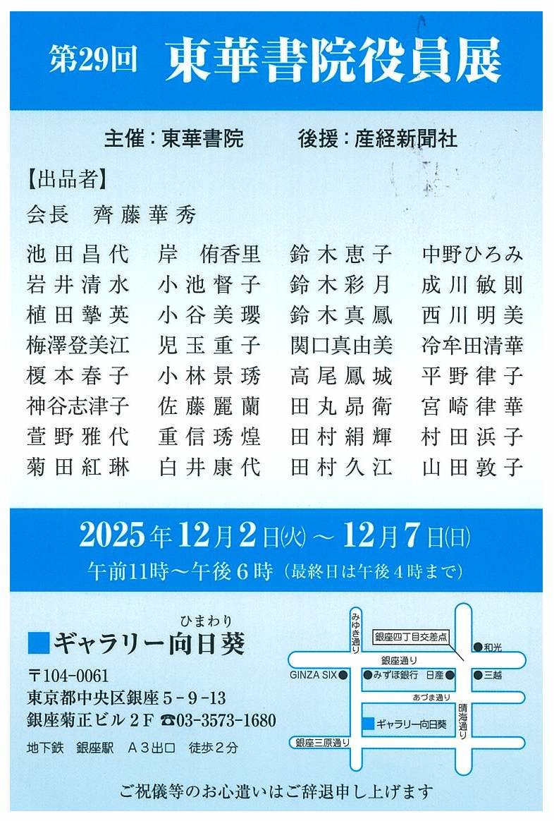 | 展覧会名 会期 会場 団体・代表名 | 第29回東華書院役員展 12月2日(火)~12月7日(日) ギャラリー向日葵 東華書院・齊藤華秀 |