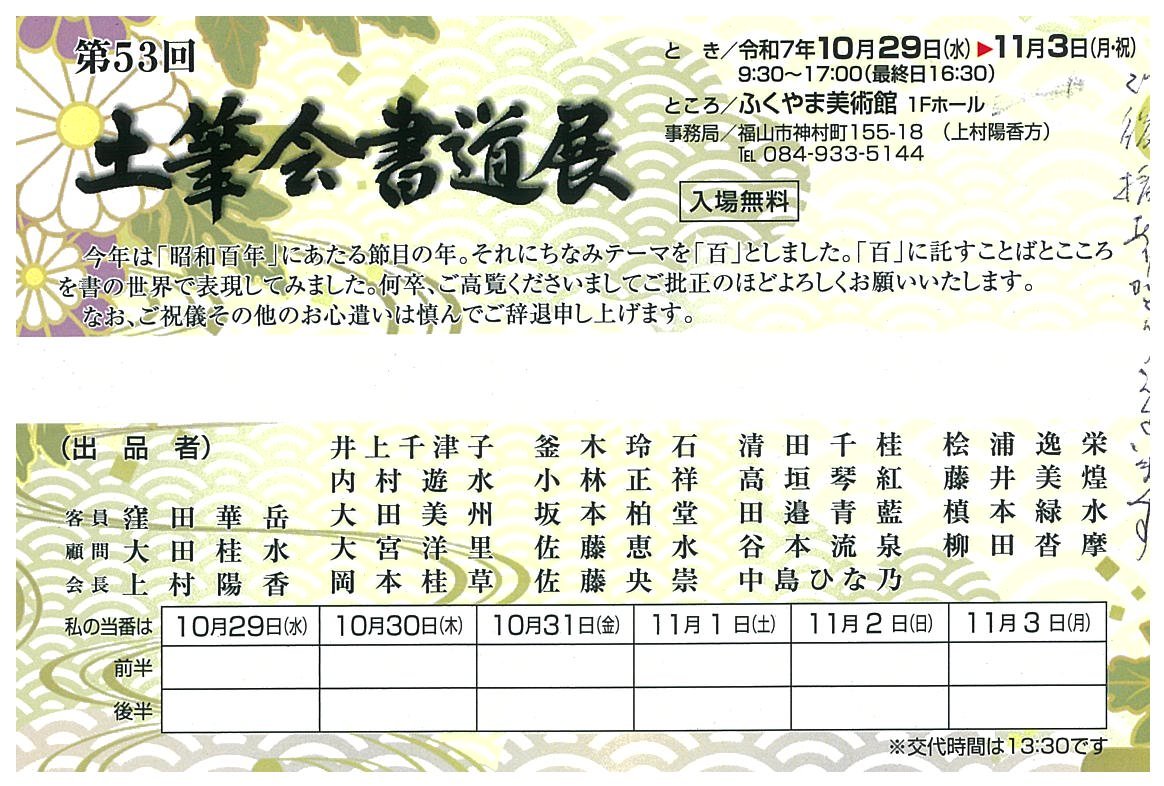 | 展覧会名 会期 会場 団体・代表名 | 第53回土筆会書道展 10月29日(水)~11月3 日(月・祝) 広島・ふくやま美術館ホール 書道研究 土筆会・上村陽香 |