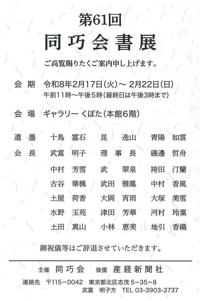 | 展覧会名 会期 会場 団体・代表名 | 第61回同巧会書展 2月17日 (火)~2月22日 (日) 京橋 ギャラリーくぼた 同巧会・武富明子 |