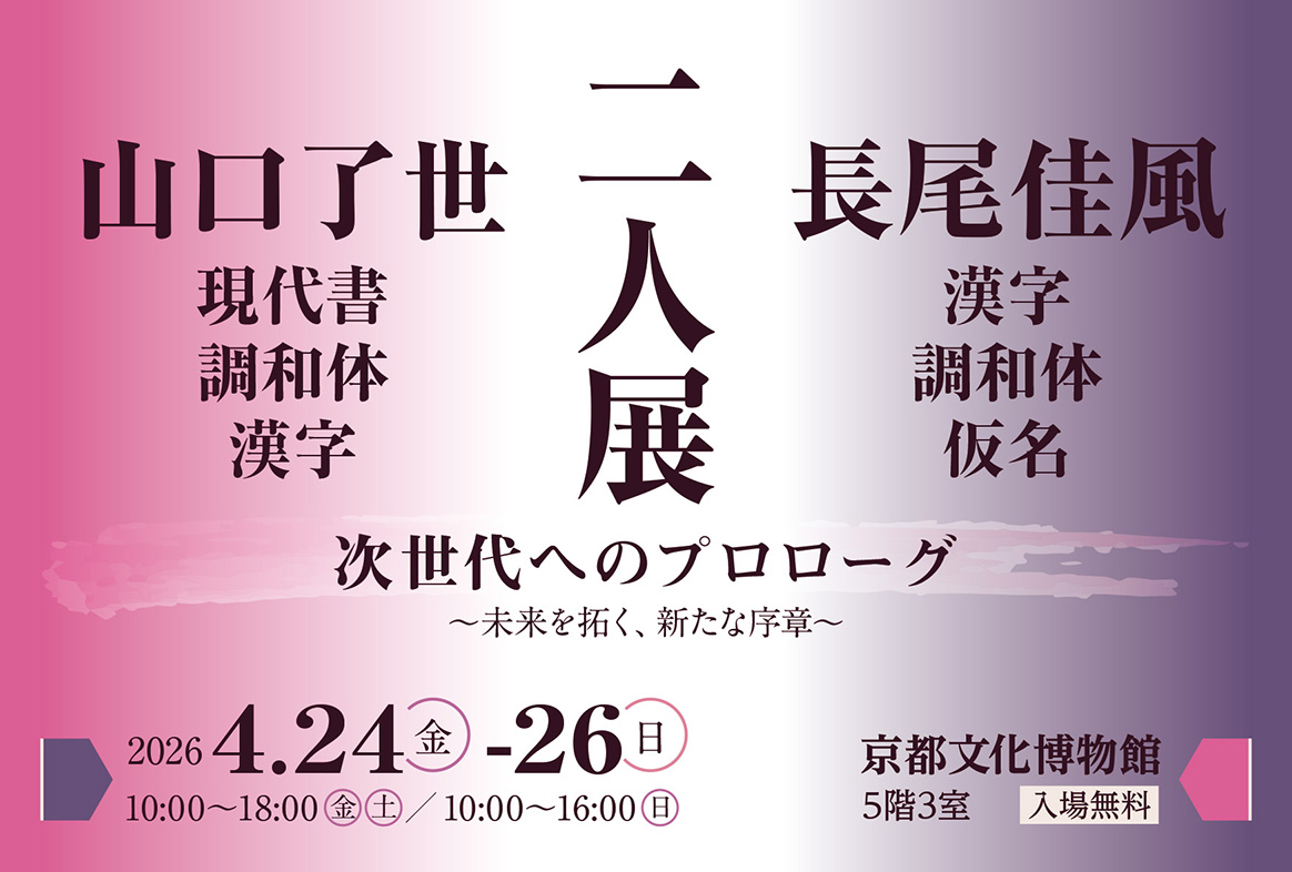 | 展覧会名 会期 会場 団体・代表名 | 二人展‐次世代へのプロローグー 4月24日(金)~4月26日(日) 京都文化博物館 二人展・長尾佳風、山口了世 |