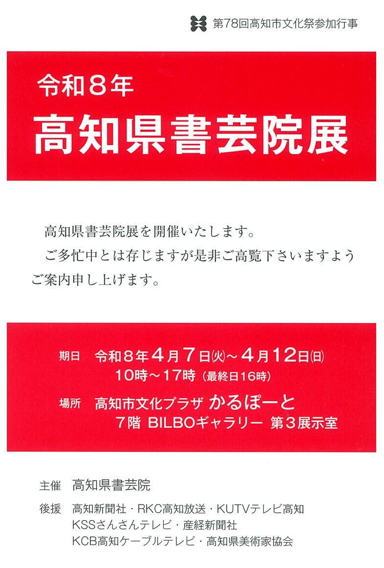 | 展覧会名 会期 会場 団体・代表名 | 令和8年高知県書芸院展 4月7日 (火)~4月12日 (日) 高知・かるぽーと 第3室 高知県書芸院・楠瀬昭峰 |