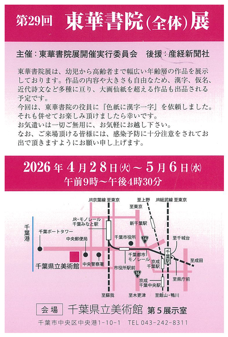 | 展覧会名 会期 会場 団体・代表名 | 第29回東華書院(全体)展 4月28日(火)~5月6日(水・祝) 千葉県立美術館 東華書院・齊藤華秀 |