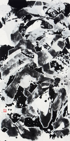 第29回産経国際書展で文部科学大臣賞に輝いた前衛書作品のタイトルはルビ「蕊(しべ)」。花のオシベ、メシベのシベだ。昨年の東日本大震災で多くの命が失われ、悲しみは癒えない。オシベの花粉をメシベが受粉し種となる、その力強く生命の連鎖が繰り返される様を復興への祈りを込めて表現した。女流書家らしく、大胆な筆使いのなかに優しさが同居する。