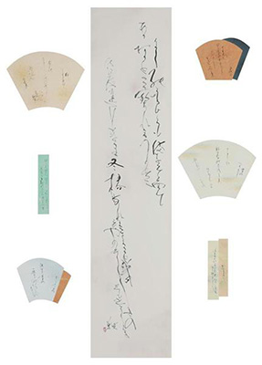 産経国際書展には2回展から出品し、細字作品で準大賞を2度受賞、22回展では「大字仮名」の作品で会長賞に輝いた。2月2日まで国立新美術館で開催中の第31回産経国際書展新春展で展示されている作品「石川啄木の歌八首」(縦240×横180センチ)は許される最大寸法の大作。中央には大字仮名で二首が、カラフルな扇面と短冊の料紙(装飾された和紙)に細字仮名で書かれた三首が、左右それぞれに配置されている。