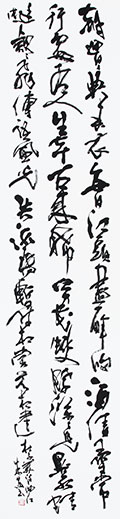 50代で独立してからは、中国の北宋時代の米芾(べいふつ)に傾倒し、範としてきた。米芾は、書聖・王羲之の研究家であり、後の中国の能書家に大きな影響を与えた。その「自然で品の良い、抑揚の部分を強調した書風」を極めたいと力強く語る。「納得のいく域に達したら2回目の個展をやりたい」とも。「振り返れば書しかなかった」としみじみと語る。