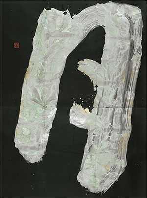 そのうちの一作「月」(縦3.6×横2.7㍍)=写真=は、黒い紙を用いて白い絵の具に金粉、銀粉、接着剤などを調合し、暗闇に浮かぶ寂しい月を表現した。この手法は、第11回産経国際書展で当時の最高賞である会長賞を受賞した作品を集大成として20年間にわたって封印してきたもの。「心に描いたイメージのままの作品」を目指して、さらなる集大成へと再び挑戦が始まった。