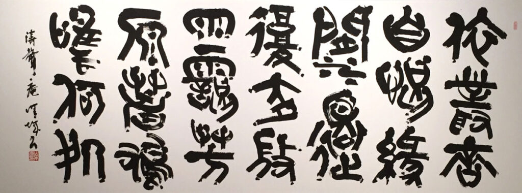 幅広く書を学んできたなかで、自身の書作活動における研究課題は、原始的な古代漢字に求めた。初期の楷書で荒削りといわれる5、6世紀頃の中国・南北朝時代の「六朝(りくちょう)の楷書」から始まり、時代を遡って木簡に書かれた隷書、そして象形文字の進化した金文にたどり着いたという。