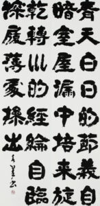 今年1月の第30回産経国際書展代表展に出品したのは中国古典の「菜根譚(さいこんたん)」の一節を書き上げたもの。二八(にはち)の紙2枚を使った味わいのある隷書の大作である。