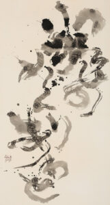 社中展に続いて11月9日から12月4日まで座・高円寺で開かれる個展「書・墨・アート vol.7」で、橘逸勢の三十帖冊子1313文字を全臨。黒い和紙を張ったパネルの上に一文字一文字を切り張りし、まるで「書の宇宙空間」のようなアート作品に仕上げた。