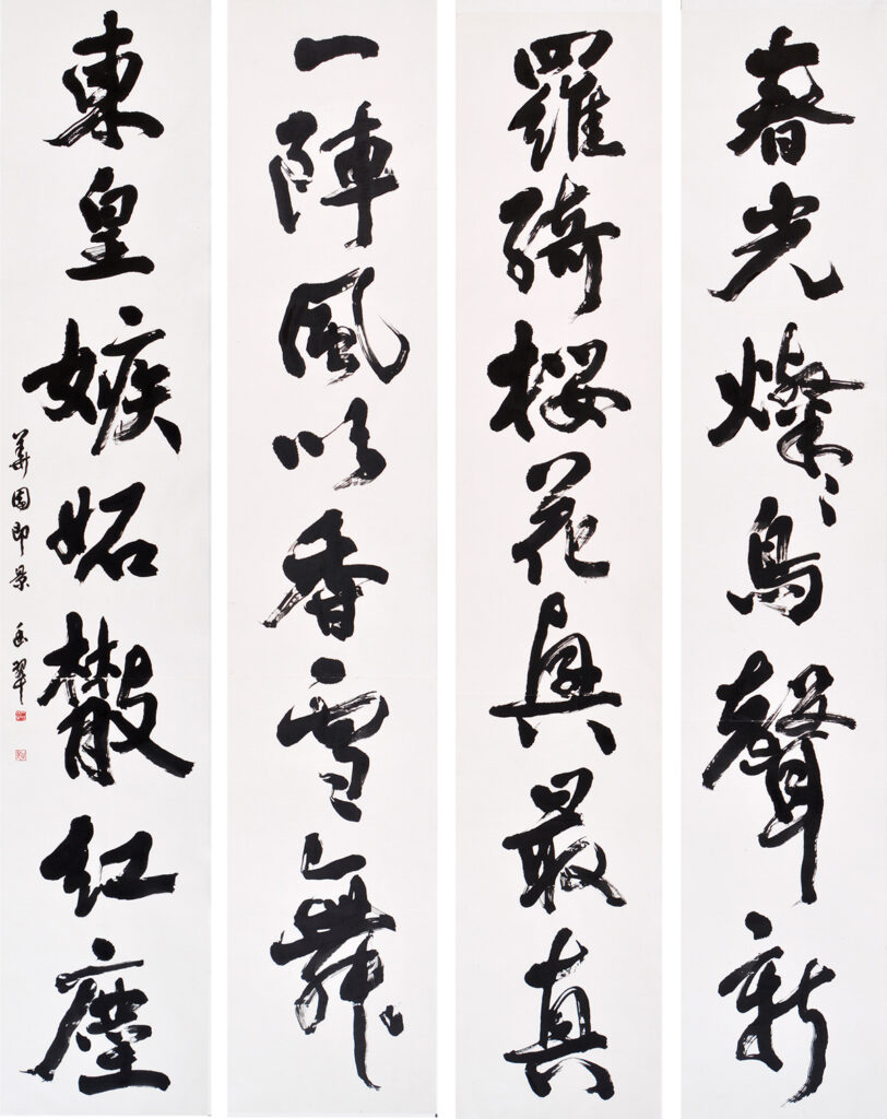 24日に東京・六本木の国立新美術館で始まった「第34回産経国際書展新春展」(2月5日まで、30日は休館)。その目玉のひとつ、大作部門に、自作の漢詩「花園即景」(縦370×横70センチ×4)=写真=を出品している。